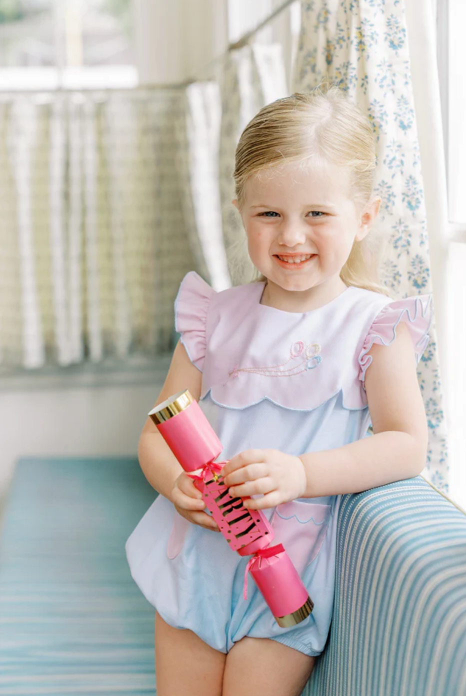 The pink and blue combination is stunning and each scallop is hand-cut by our seamstress. The look is delicate and lovely. The perfect style for any birthday occasion or any other happy day.