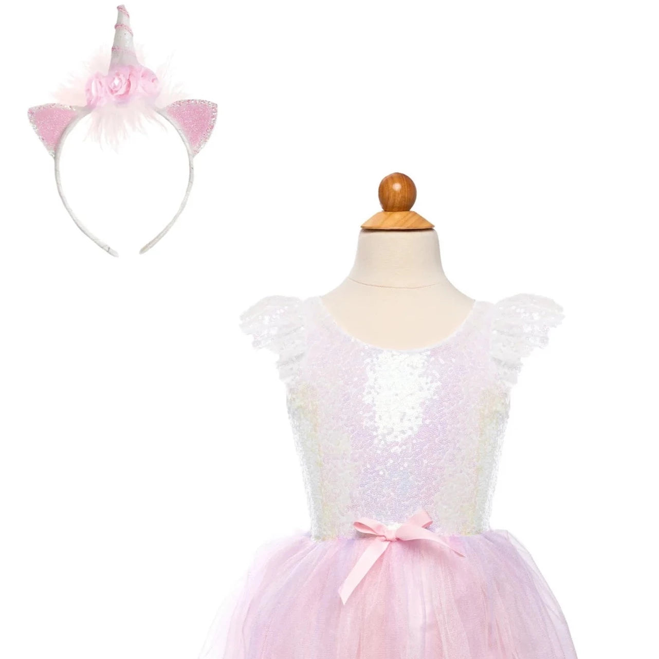 The top of the dress is adorned with mesmerizing iridescent sequins that shimmer and shine, creating an ethereal effect reminiscent of a unicorn's magic. A dainty bow at the waist adds a touch of sweetness and charm, enhancing the overall grace of the outfit.