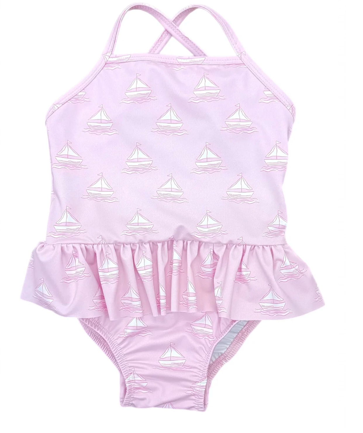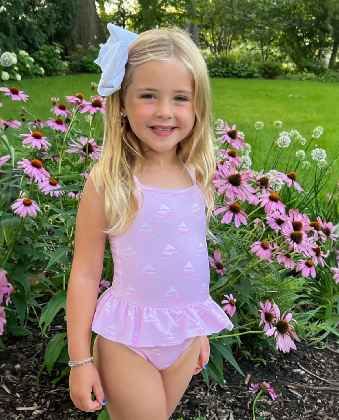 Get ready to set sail in style with our Lainey Set Sail Sailboat Skirted One Piece Swimsuit! Perfect for the beach or pool, this darling swimsuit will make your little one stand out with its playful sailboat design. Order now for a summer full of fun and fashion!
