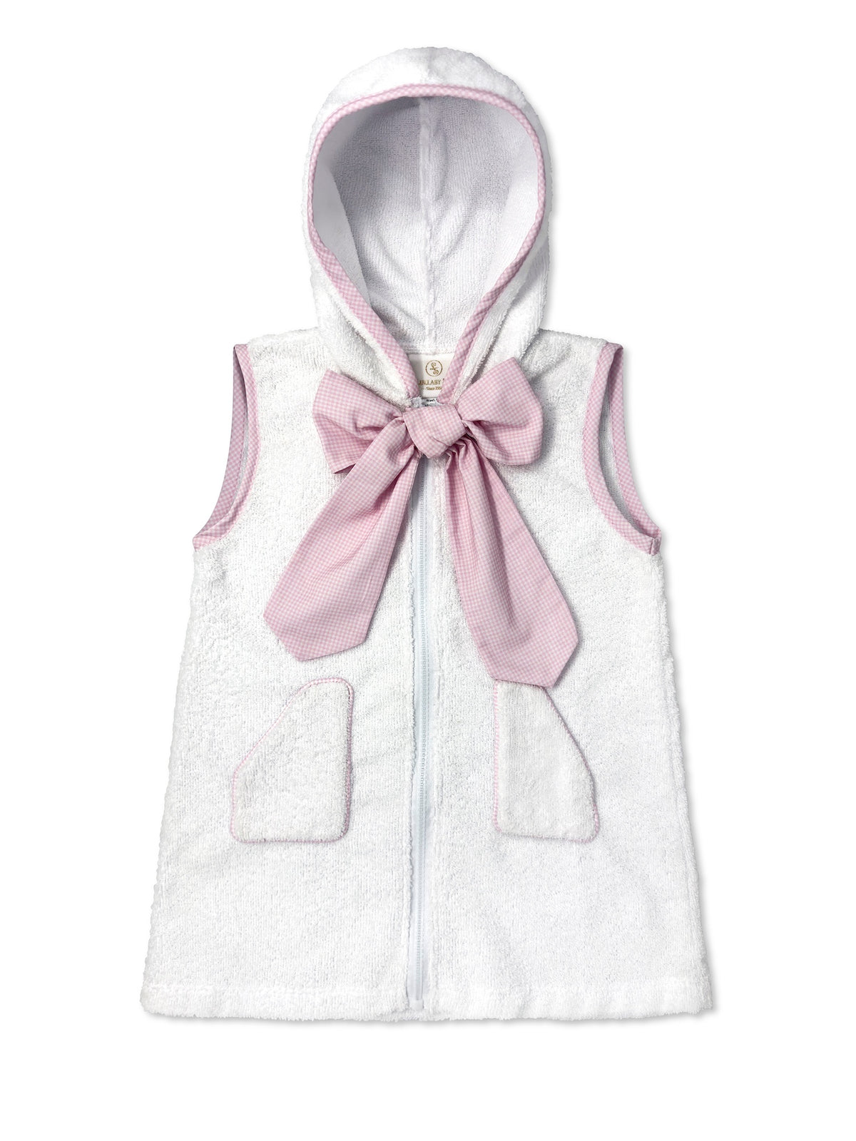 From sunrise to sunset, your little girl will be ready for summer vacation with this hooded cover up in Legacy white terrycloth with baby pink minigingham welting, piping, and bow. Whether you are headed to the beach or the pool, this knit cover up is the perfect outfit between swims - allowing a day of sun-soaked fun.