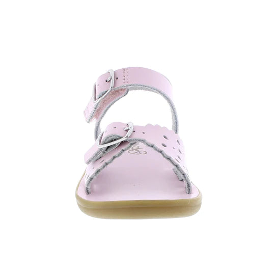 OPEN-TOE, OPEN-HEEL MICROFIBER SANDAL FEATURING TRUE-BUCKLE FOREFOOT STRAP WITH DECORATIVE TEAR-DROP PERF DESIGN AND HOOK-AND-LOOP ANKLE STRAP WITH DECORATIVE BUCKLE.