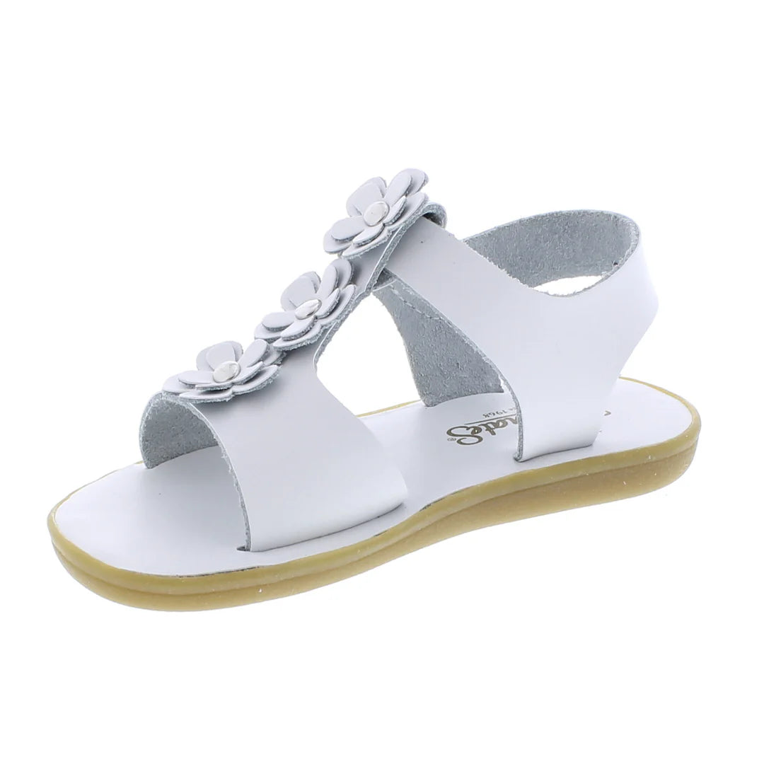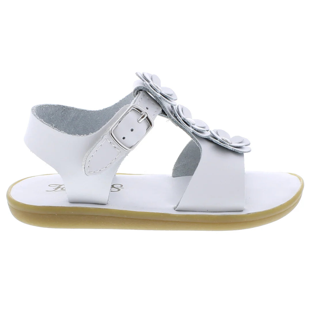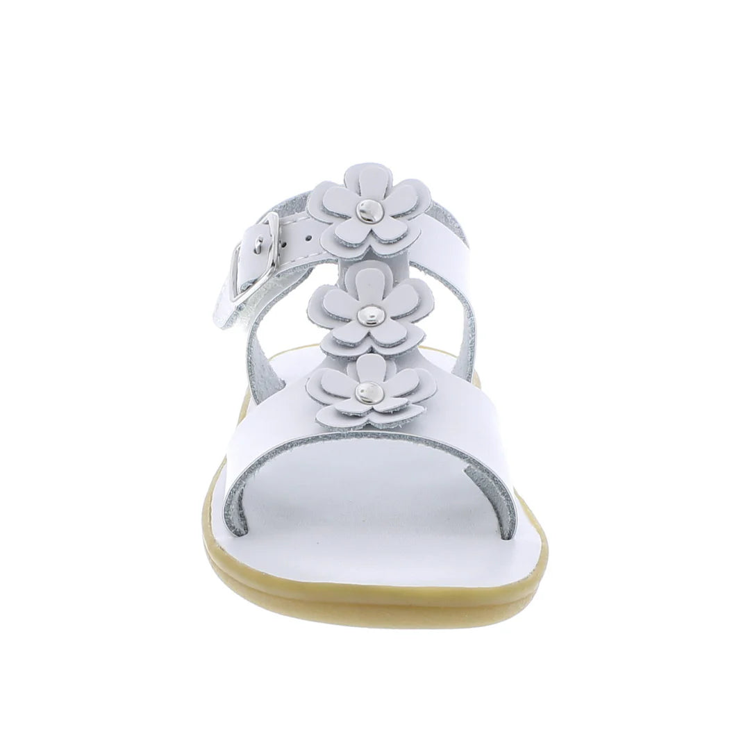 OPEN-TOE, OPEN-HEEL MICROFIBER T-BAR SANDAL FEATURING HOOK-AND-LOOP ANKLE STRAP WITH DECORATIVE BUCKLE AND (3) DOUBLE-LAYER FLOWER APPLIQUES ON T-BAR. OFFERED IN MATTE AND METALLIC COLORS; SIZES RANGING FROM 3.0 INFANT - 3.0 YOUTH.