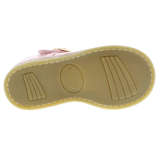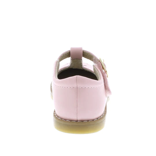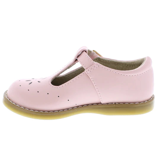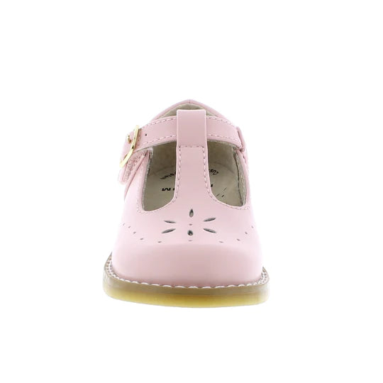 TRADITIONAL LEATHER T-BAR MARY JANE FEATURING HOOK-AND-LOOP ANKLE STRAP WITH DECORATIVE BUCKLE AND STAR PERF VAMP DESIGN.