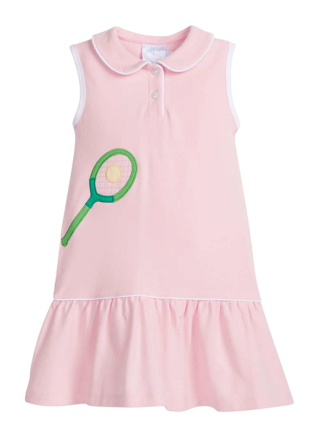 Our Applique Polo Dress - Tennis is a sleeveless style that features a drop waist, white contrast piping, and a fun green racket and yellow ball applique. This light pink pique dress is perfect for taking your little girl from lessons to lunch!