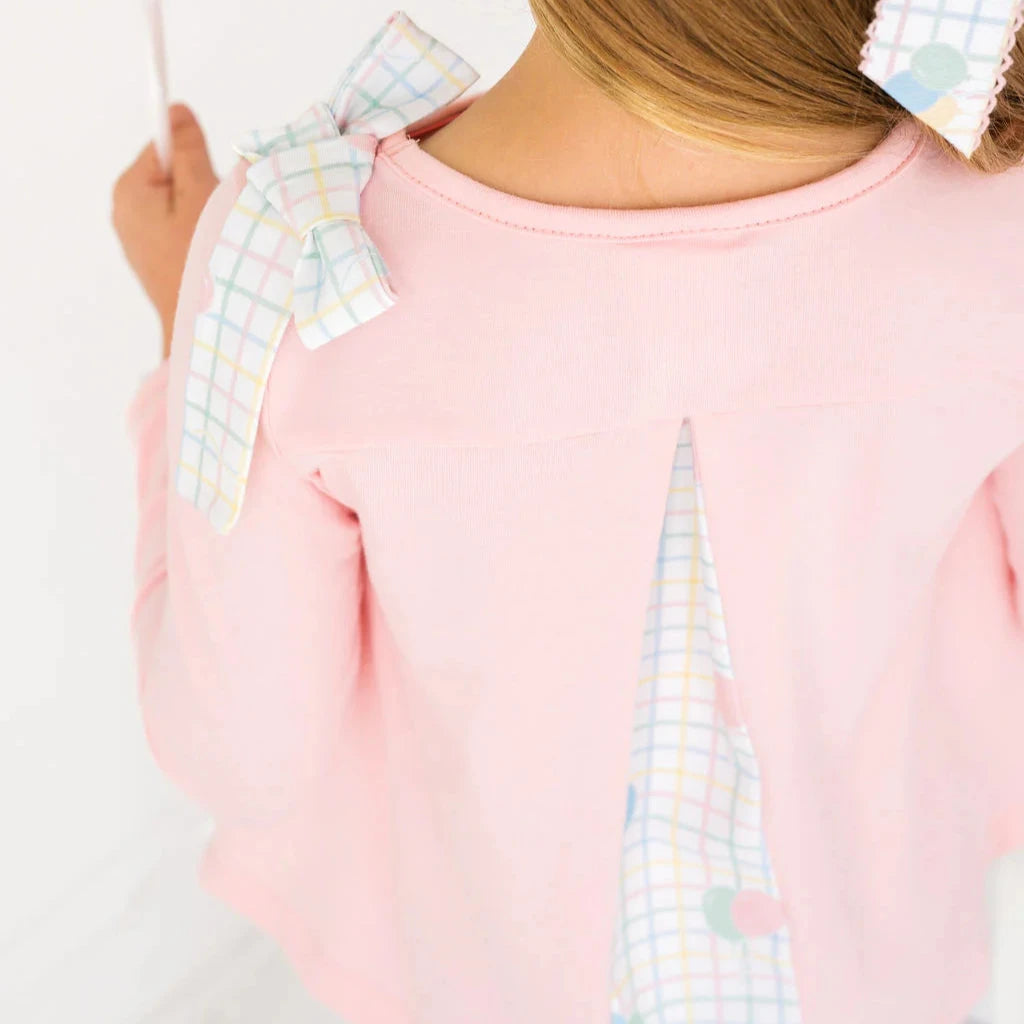 A new style this season, the Madeline Legging Set is sure to be a favorite. This Pensacola Pink knit top has a fun shoulder bow and back pleat detail in our Party Time Balloon Plaid print. The top is paired with matching leggings. The perfect outfit for all her friend's parties.