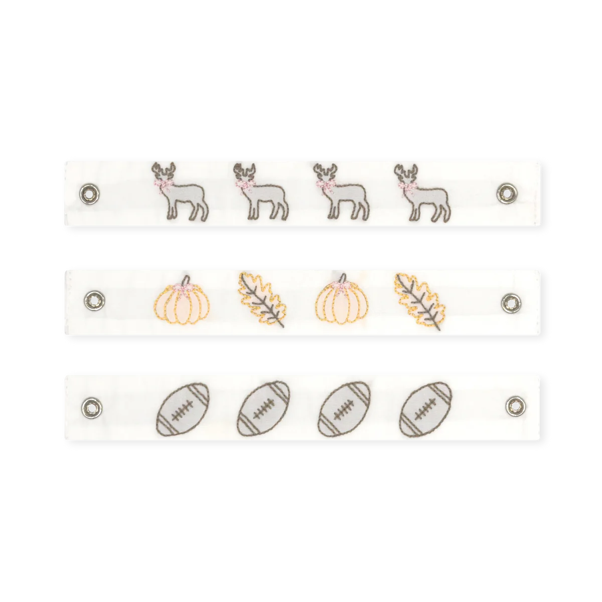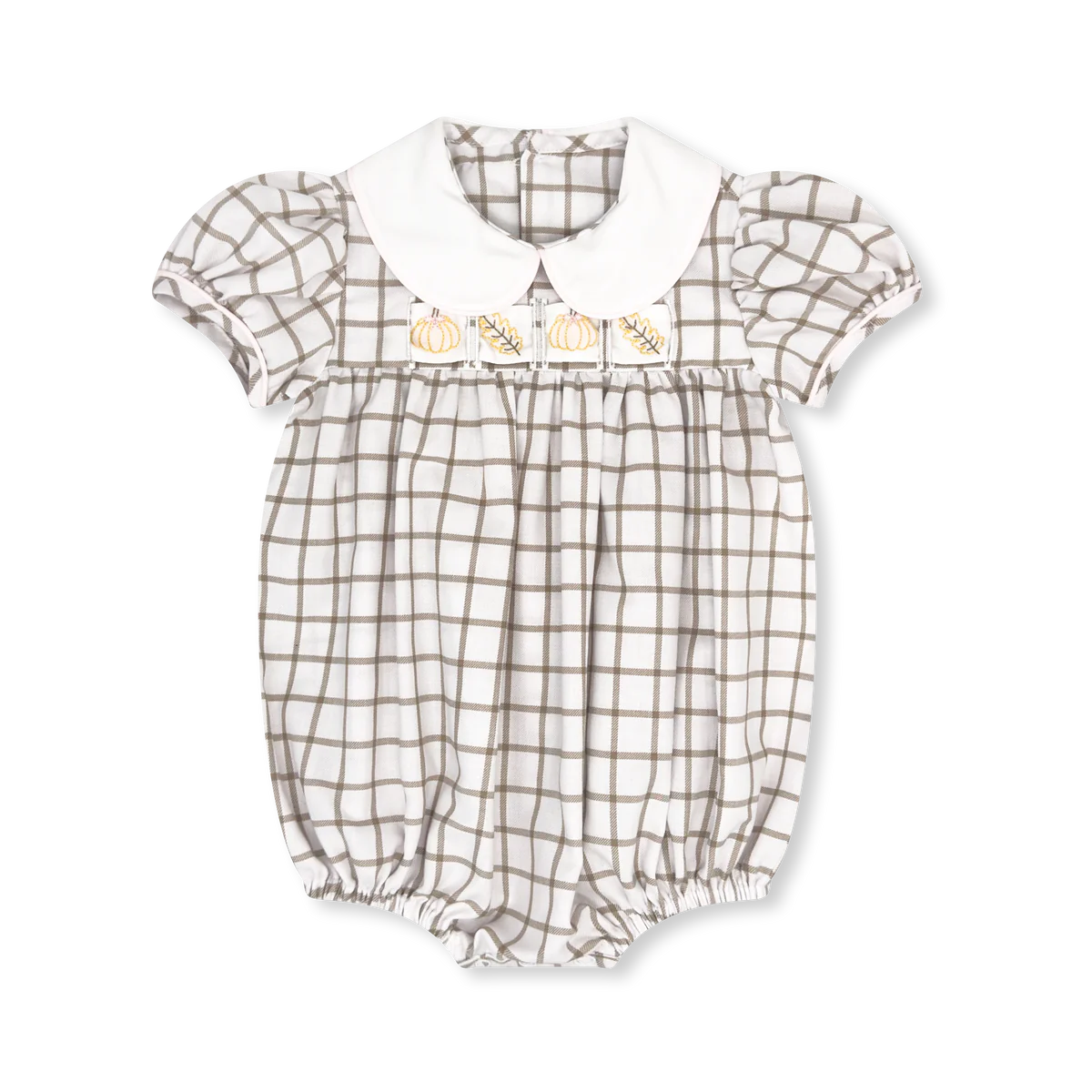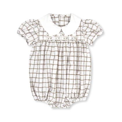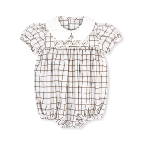 Our Ruth Ribbon Bubble is a Lullaby Set classic. This timeless bubble is back this season with a fresh new look in King Street Khaki woven windowpane with light pink piping along the collar and sleeves. The interchangeable ribbon detail that weaves across the front of the bodice makes this a versatile bubble appropriate for football season, Thanksgiving, and everything fall.