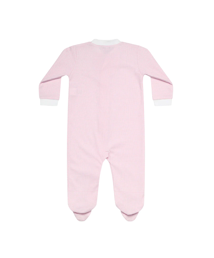 The Pink Gingham Zipper Footie is a charming piece adorned with an all-over print in   a delightful shade of Pink. It comes equipped with a front zipper and a safety tab to make diaper changes easier. Made entirely from 100% Pima cotton, this footie is gentle on even the most delicate skin