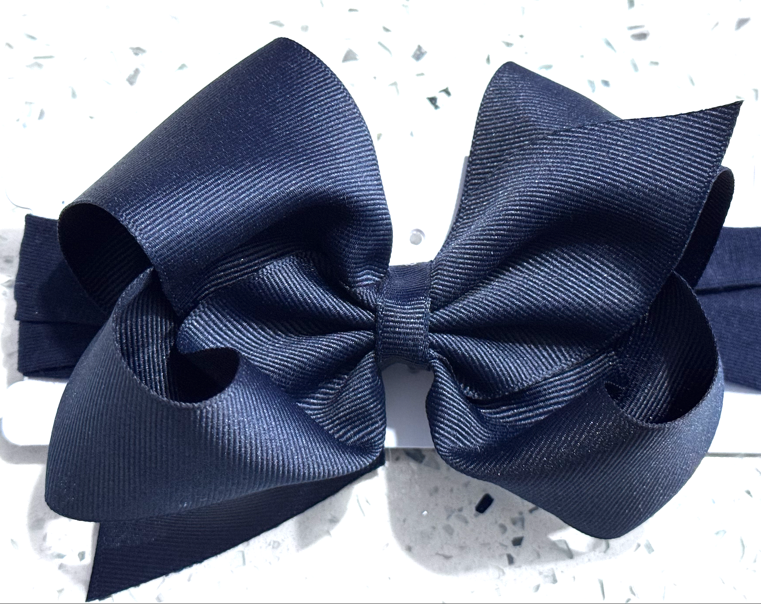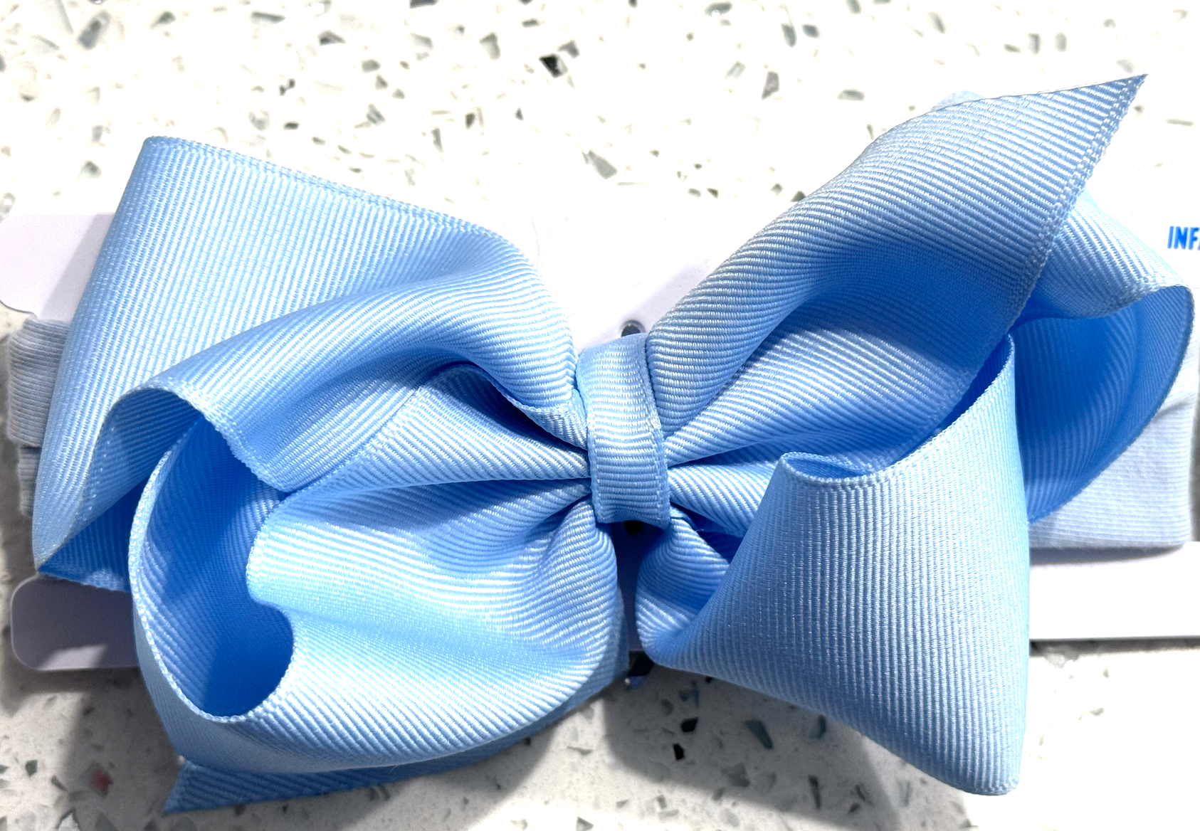 Our mini king classic grosgrain bow is now perfect for baby after adding it to this matching soft elastic band. Available in light pink and white.