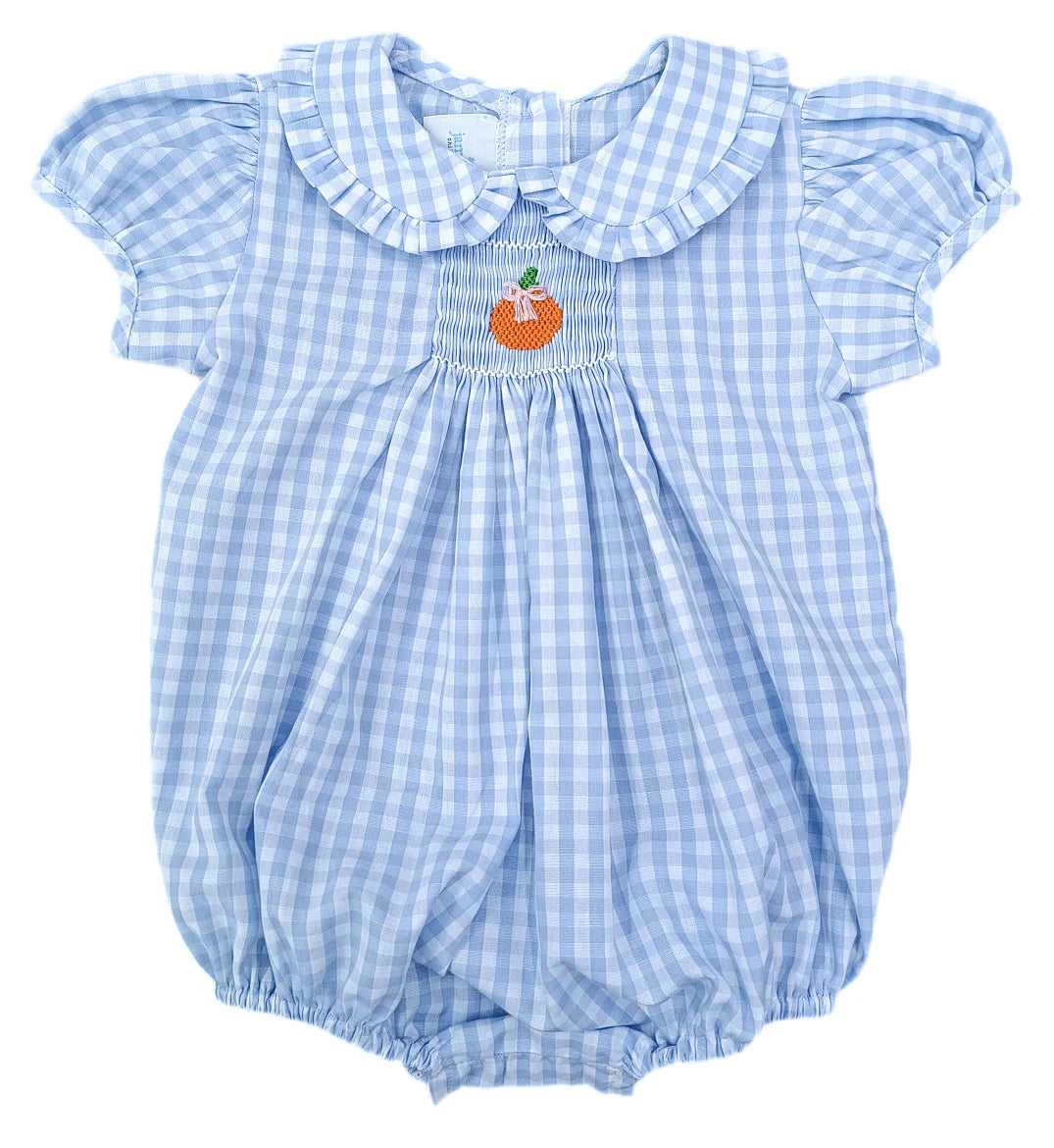 James & Lottie: Margaret Blue Gingham Bubble, Smocked Pumpkins