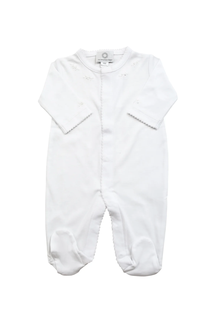 Made of the softest Pima cotton, our Footed Pajamas are perfect for both day and night. The delicate, simple embroidery makes this style a timeless classic. Perfectly coordinates with our full Proper Layette collection. All pajamas hand-embroidered with white, pink or blue accents.