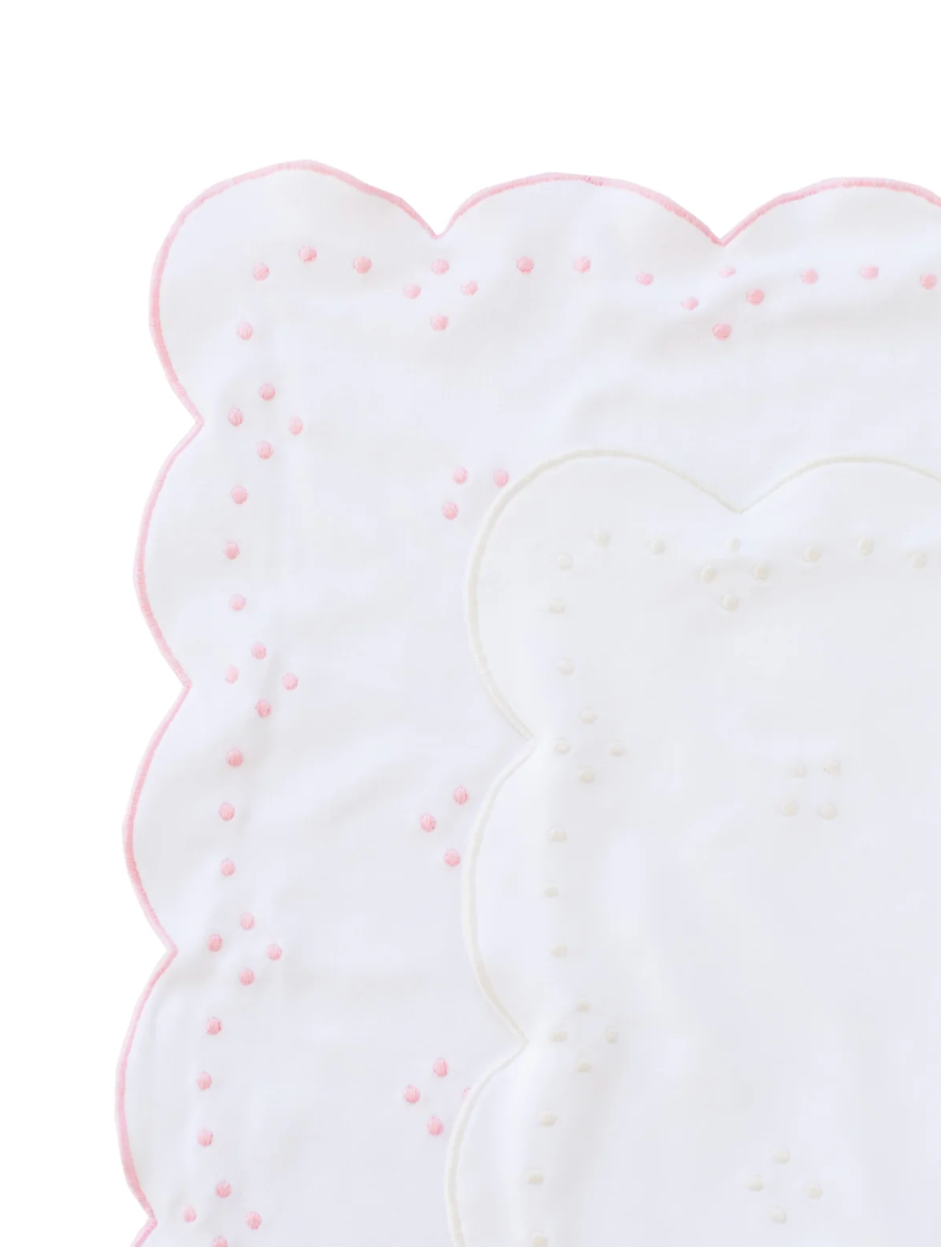 The Proper Peony Receiving Blanket in Scalloped Dot is made of 100% cotton, double layered, with timeless hand-sewn embroidery. Blanket is packaged with a satin bow and ready for gifting!
