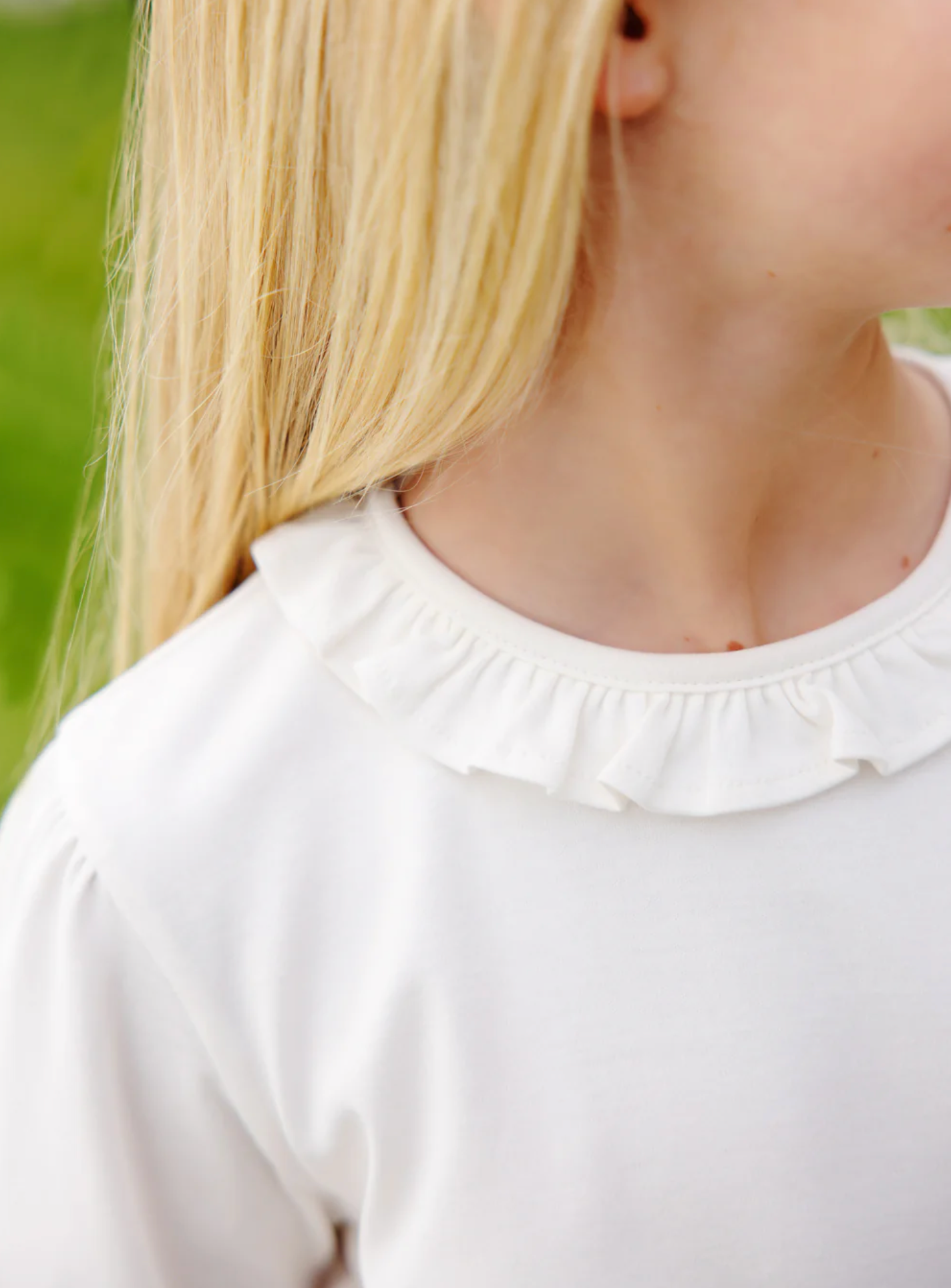 This sweet piece is essential to your girl's wardrobe! As the air grows crisp and cool, our Reece Ruffle Top in Palmetto Pearl is the perfect way to layer this fall season.